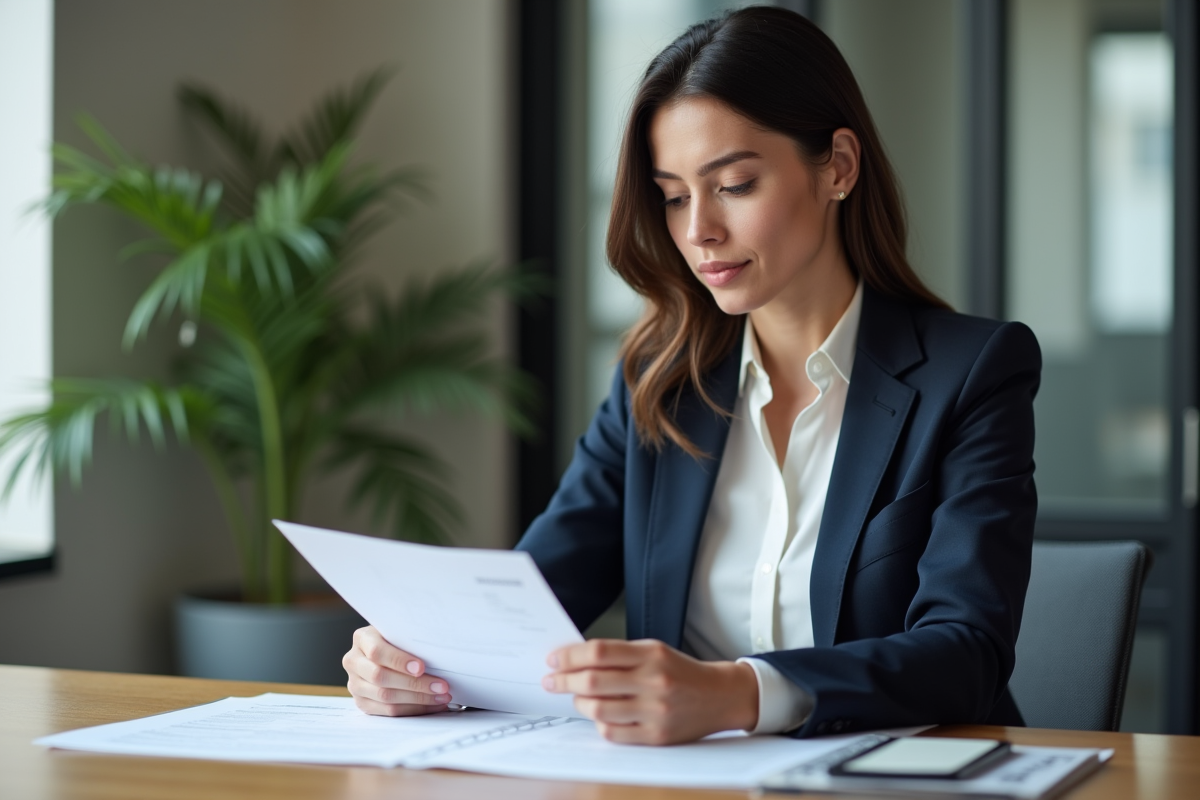 Femme d'affaires en blazer examinant des documents de prêt immobilier